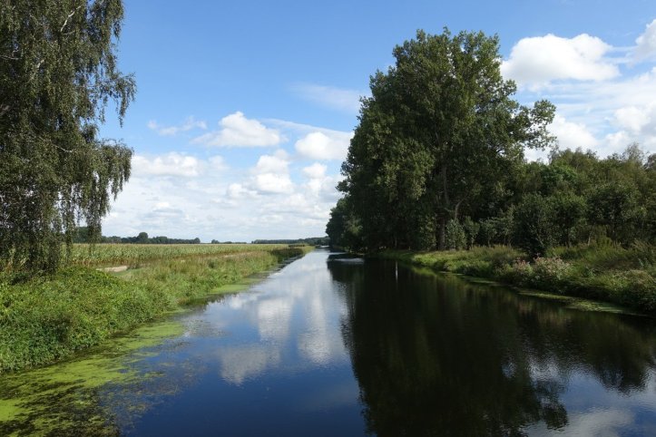Die Wegmarkierung hat mich heute mal wieder im Stich gelassen und ich folge einer Komoot Route (Komoot ist eine Wanderapp). Der Weg führt langwierig aus Harsewinkel heraus und führt dann kilometerlang an der Ems entlang. Mal rechtsseitig, mal linksseitig.