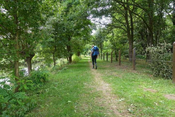 Der Weg ist zwischendurch sehr zugewachsen und ich kämpfe mich streckenweise durch hüfthohe Brennesseln. Meine lange Leggins war die richtige Entscheidung. Zwischendurch wechsel ich sogar auf ein Feld und bin froh, dass die letzten 8 Kilometer vor Warendorf ein wahres Spaziergänger Paradies sind. Wunderbare angelegte Wege, vorbei an großen Wiesen und Weiden. Mir geht es körperlich für den zweiten Tag recht gut, aber mein langsames Tempo bringt mich schleppend voran.