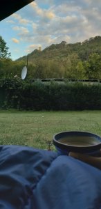 In Ruhe gibt es Porridge und heißen Kaffee als wärmendes Frühstück. Gemütlich sitzend und halb im Schlafsack, geniesse ich die Sicht auf den Turm und erledige fix am Handy einige Dinge. Bis alles zusammen gepackt ist, zeigt die Uhr 09:30 Uhr an. Höchste Zeit zum Loslaufen.