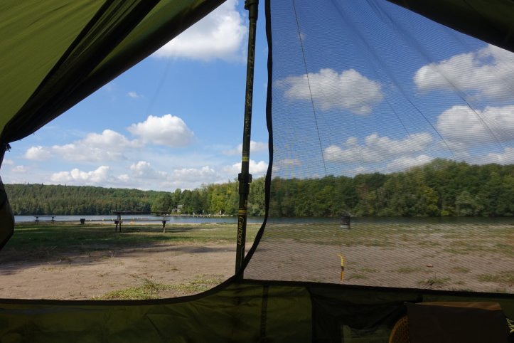 Hier in Brühl liegt der Campingplatz direkt am Heider Bergsee. Die Größe mit 34,5 Hekter kann sich sehen lassen, und ich staune nicht schlecht, als ich mein Zelt 50 Meter vor dem Ufeer aufschlagen darf.