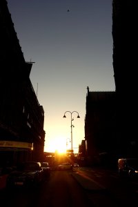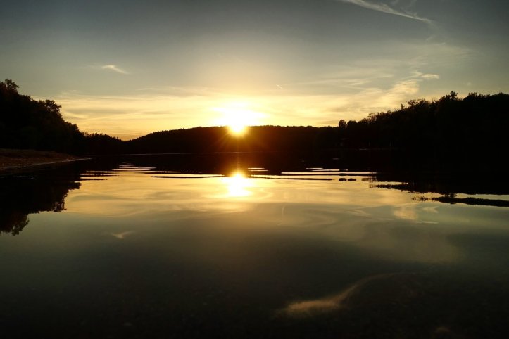 Der Sonnenuntergang am Abend leuchtet golden über den schwärzlich aussehenden Wasser.