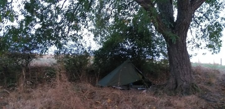 Auf einer Wiese sehe ich einen großen Baum umgeben von Büschen. Da der Wald noch deutlich weiter weg ist und die Dämmerung bereits einsetzt, versuche ich hier mein Glück. Meine erste Nacht Wildzelten steht bevor.