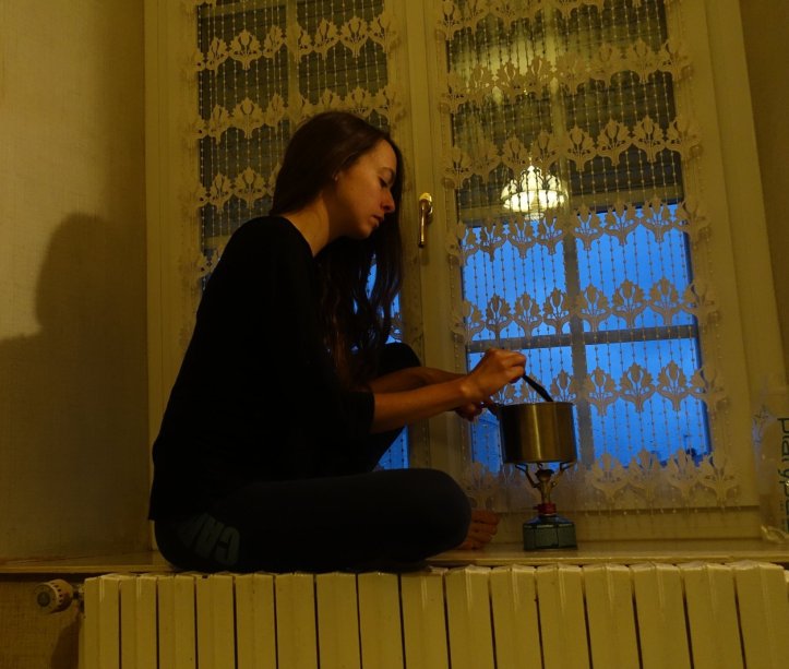 Langsam wärmen sich meine Hände wieder auf. Das Gefühl und die Feinmotorik kehrt zurück. Die Heizung funktioniert und dort verbringe ich die Zeit am Fensterbrett bis es aufhört zu regnen. Schnell begebe ich mich in den lokalen Supermarkt und kaufe großzügig ein, da ich genug für die morgige lange Etappe brauche.