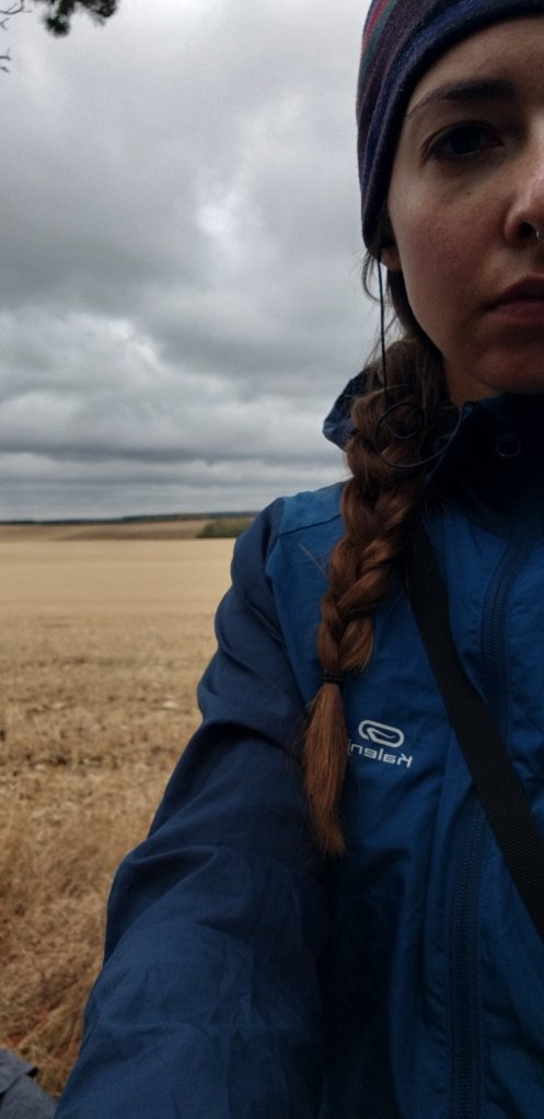 Ich kämpfe mich von Ortschaft zu Ortschaft und frage mich, was ich hier eigentlich tue. Es sind 8°C, der Niederschlag ist gleichmäßig, der Wind erbarmungslos. Zwischen den Orten laufe ich auf wenig befahrenen Straßen auf ungeschützten Flächen, die Felder um mich herum abgearbeitet.