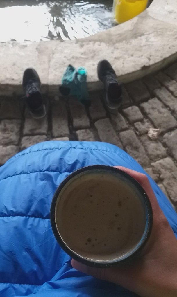 Ich hole meine Zeltunterlage heraus und breite sie auf der dreckigen, steinigen Bank aus. Als nächstes meinen Schlafsack, welchen ich auf dem Plastik ablege. Ich ziehe meine Schuhe, Socken und Leggins (alles ist klitschnass) aus und steige in meinen Schlafsack und setze ich mich auf die Unterlage. Mit meinem Gaskocher wird Wasser erwärmt und in meine Trinkflaschen gefüllt. Die Wärmflaschen und ein Becher heißer Kaffee erzielen Wirkung. Meine Füße werden langsam wärmer und Gefühl kehrt schmerzvoll und kribbelnd zurück.