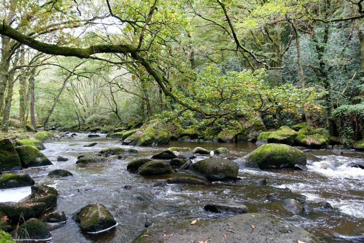 Die Natur zeigt sich von einer märchenhaften Seite. Im Wasser sind große zum Teil vermoste Steine und ein Wald, der sich um uns herum erstreckt, dessen Bäume verziert von Efeu sind. Eine sehr verträumte Umgebung bietet sich uns.
