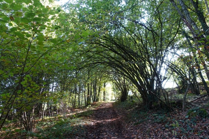 Leider ist das Café im Ort montags geschlossen und so wandern wir weiter. Statt des typischen Jakobswegs laufen wir die kürzere GR-Wanderroute, die über einen alten Waldweg führt. Der Pfad wird von moosbewachsenen Steinmauern umrandet. Am Gipfel befindet sich ein kleines gallo-romanisches Theater.
