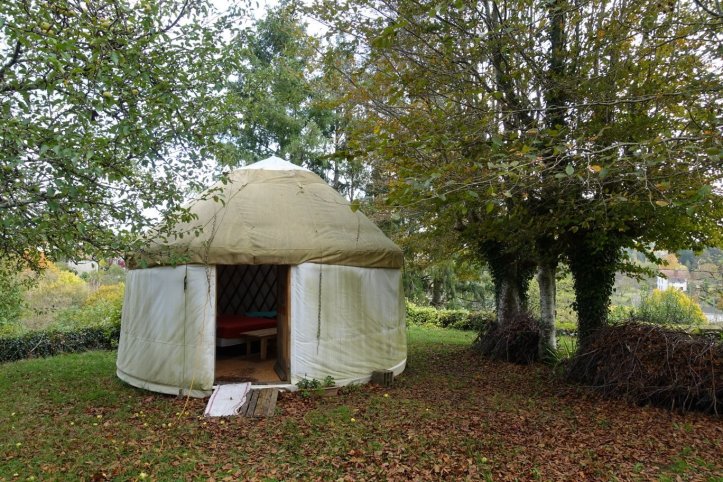 Um 17:00 Uhr gehen wir eine Straße weiter, wo wir einchecken können. Eine nette Frau bringt uns in den Garten, wo uns eine Jurte erwartet. Ich freue mich sehr über diese eher ungewöhnliche Schlafmöglichkeit. Das runde Zelt macht einen etwas älteren Eindruck, ist dennoch in gutem Zustand. Ein paar kleine Schränke, Tische, ein Doppelbett und ein Waschbecken sind kreisrund entlang der Wand aufgestellt, sogar Strom gibt es. Die Trockentoilette ist draussen im Garten und eine Dusche befindet sich im Haus.