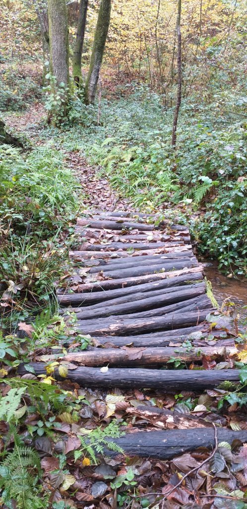 Die Weide ist letztendlich doch schnell durchquert und prompt wartet die nächste kleine Herausforderung im Wald. Mit Blättern übersähte Holzbretter sind auf matschigen Untergrund gelegt worden und führen zu einer kleinen Brücke. Diese besteht aus einzelnen aneinandergereihten runden Hölzern und ist mittlerweile nicht mehr eben, sondern leicht nach links abgerutscht.