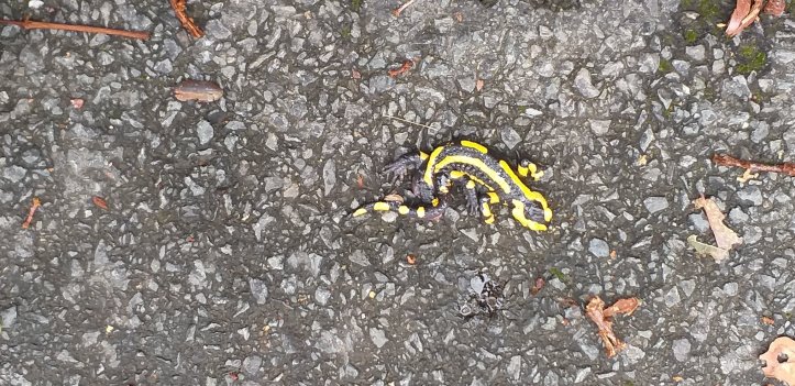 Auf der Straße finde ich einen toten Salamander vor, dessen bunter Körper ins Auge sticht.