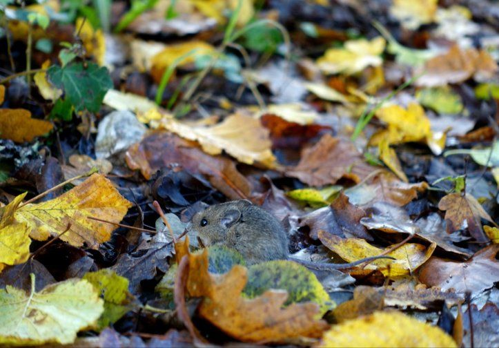 Kurze Zeit später setze ich meinen rechten Fuß fast auf eine kleine Maus, die zwischen den Blättern sitzt. Sie ist winzig und ihre kleine Knopfaugen gucken uns aufmerksam an.