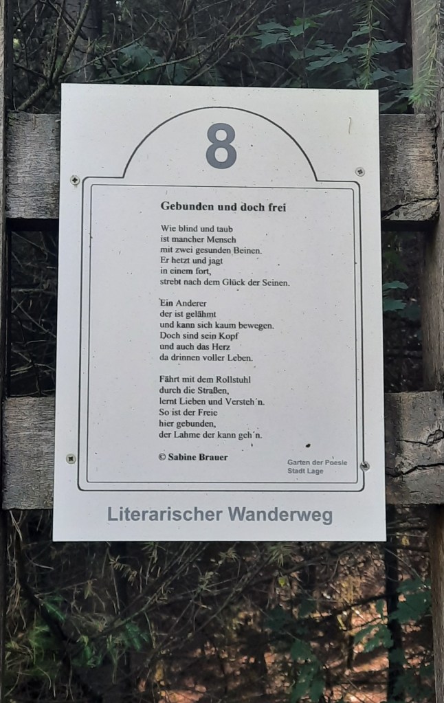 Der Ort Lage hat auf einem Teilweg Schilder mit kleinen Gedichten zum Wandern angebracht, die alle paar Meter zu finden sind.