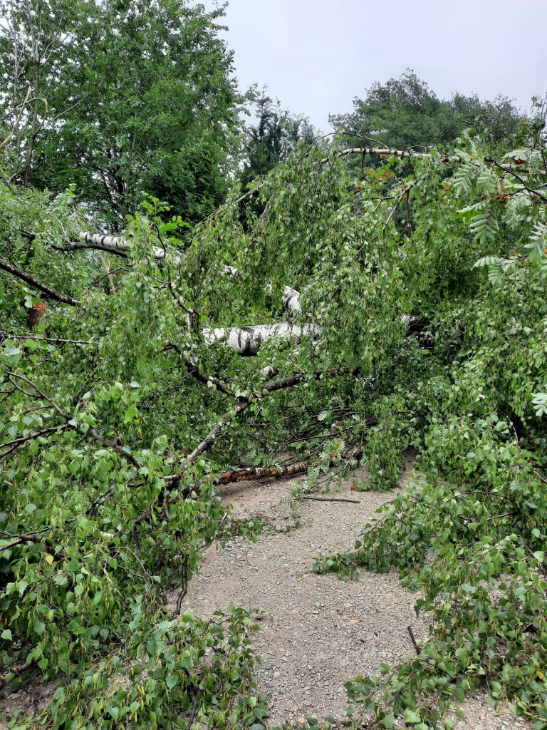 Zwei Minuten später stehe ich vor einer großen Birke, die mitten auf dem Weg liegt. Der Boden um die Wurzel steht gute 3 Meter in die Höhe.