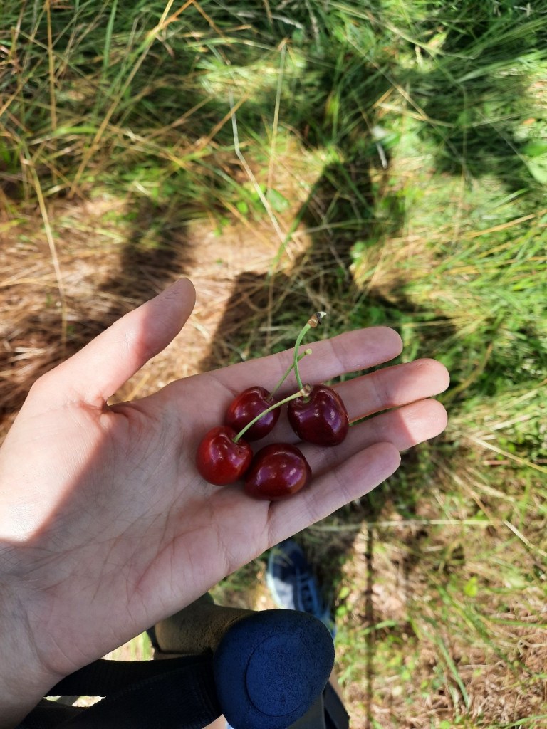 An großen Kirschbäume recke ich mich, um an die köstlichen roten Früchte zu gelangen.