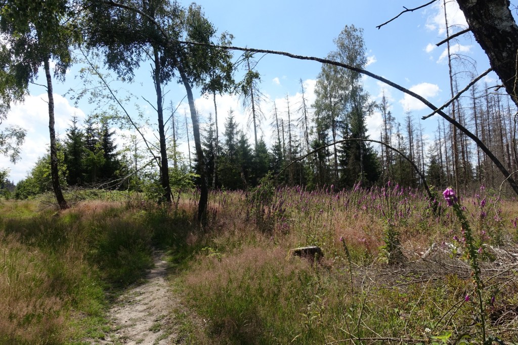 Zwischenzeitlich laufe ich sehr viel in der Sonne, da viele Bäume tot oder abgeholzt sind. Ein ganzer Wald scheint nicht überlebt zu haben, die traurige Kulisse lässt mich sehr nachdenklich werden.