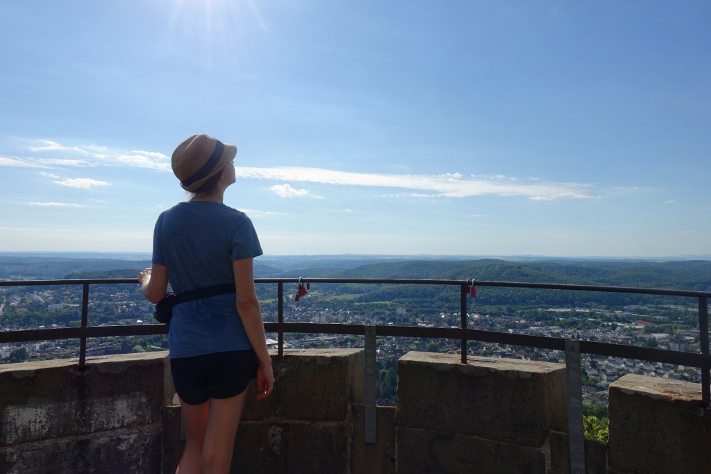 Der Weg geht steil bergauf zur Ruine der Iburg und dem Kaiser-Karls-Turm. Ich lasse meinen Rucksack am Eingang des Aussichtsturms zurück und steige die Treppen nach oben. Der Blick über Bad Driburg ist wunderschön und hier alleine zu sein, macht mich noch ein bisschen glücklicher.