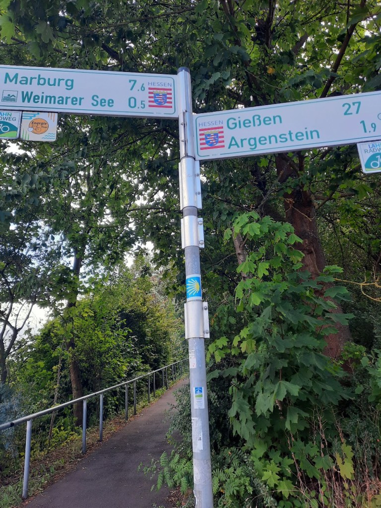 Irgendwann sehe ich die erste Jakobsweg Wegesmarkierung zwischen Marburg und Giessen.
