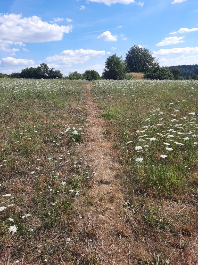 Weilburg liegt an der Lahn und im Zentrum führt der Weg am Fluss für gut einen Kilometer weiter. Um den Campingplatz meiner Wahl zu erreichen, weiche ich von der herkömmlichen Route ab. Bergauf über Wiesen ist es wunderschön. Der Weg ist nicht immer klar zu erkennen, ist hier aber nicht so schlimm.