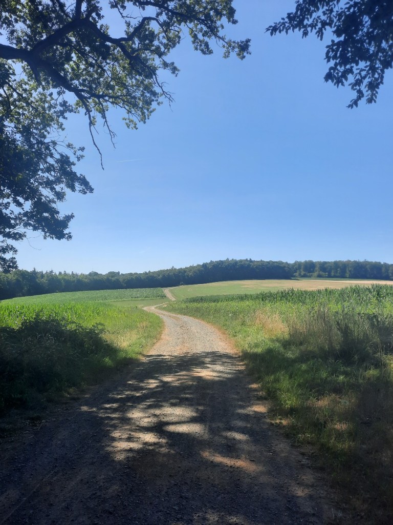 Zugewachsene Feldwege sind kaum passierbar und mit einem lauten „F*ck it“ nehme ich den Umweg über die ruhige Landstraße in den Ort Weinbach, wo ich wieder auf den Jakobsweg treffe.