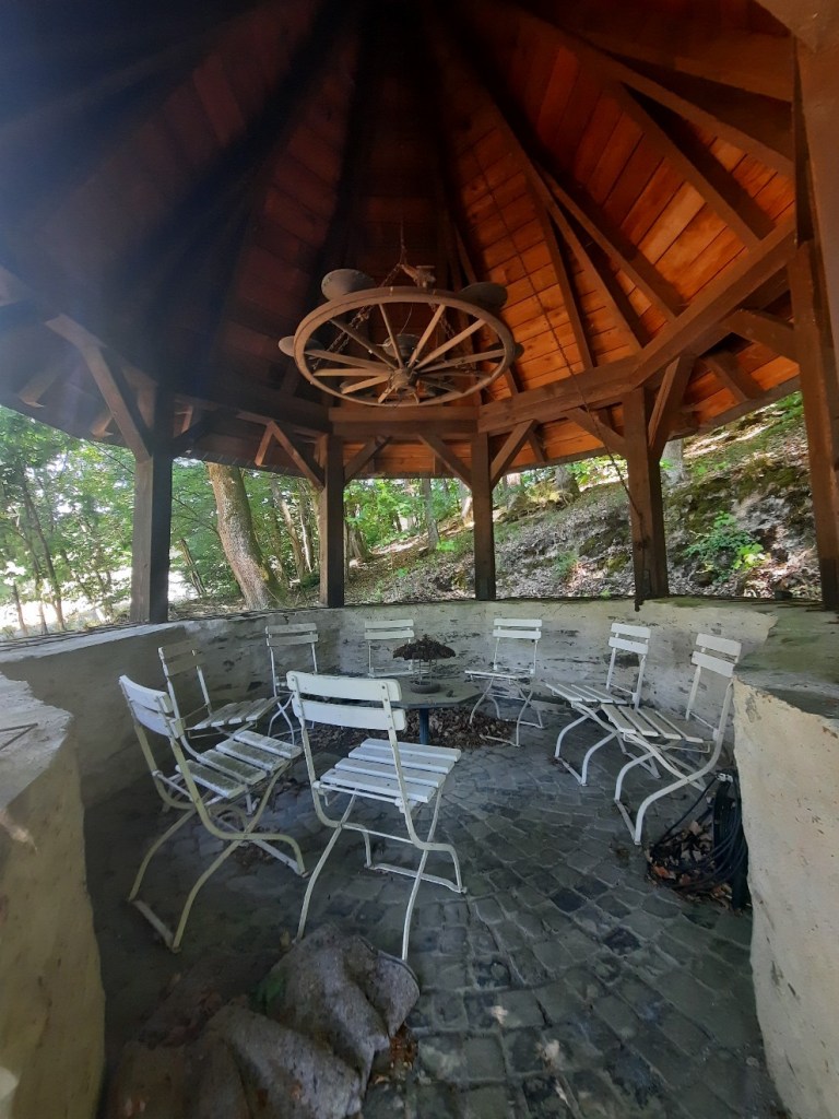 Gegen 13 Uhr finde ich eine größere Hütte vor. Mit Metalstühlen im Kreis angeordnet, sieht es so aus, als ob sich hier öfter Leute treffen.
