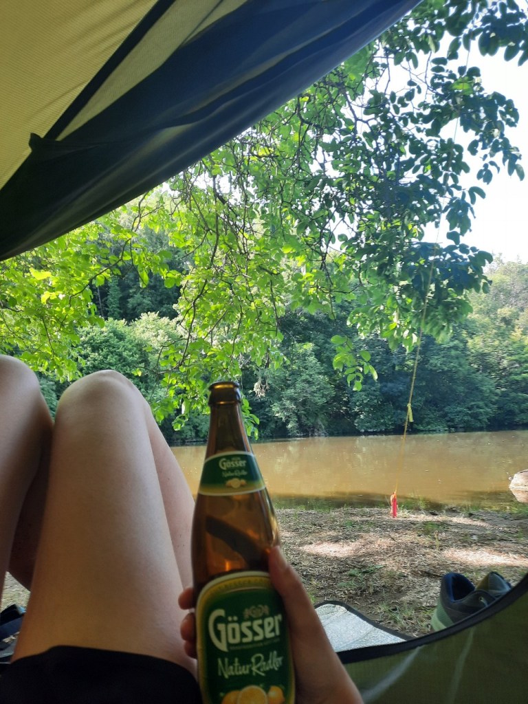 Die zwei Kilometer zum Campingplatz ziehen sich sehr. Die Belohnung ist umso größer, denn der bisher schönste Zeltplatz bietet sich mir. Unter einem großen Nußbaum nur drei Meter von der Lahn stelle ich mein kleines Zuhause auf. Von hier aus kann ich direkt schwimmen gehen und ich freue mich über die herrlich frische Abkühlung.