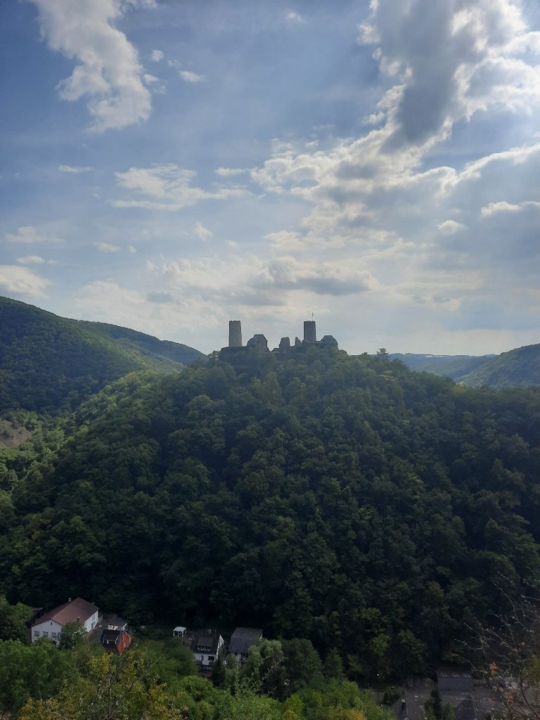 Die erste lange Pause mache ich um 16:00 Uhr bei der Wallfahrtskirche Bleidenberg. Von hier hat man einen wunderbaren Blick ins Tal und die Burg Thurant.
