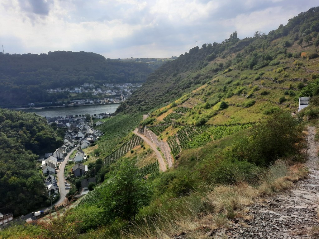 Der Pfad kreuzt nun den Moselsteig und es geht steil bergab. Der schmale Pfad und der steinige Untergrund sind für meine müden Füße eine Herausforderung. Der Blick über die Mosel und die ersten Weinberge entschädigen direkt.