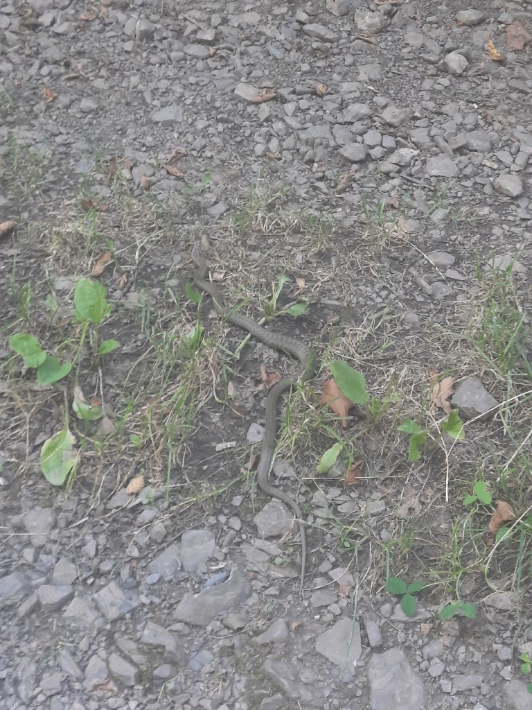 Plötzlich kriege ich einen Schrecken, ich wäre fast auf eine Schlange drauf getreten. Das zweite Tier innerhalb von zwei Tagen. Sie bleibt ruhig liegen und mit einem Bogen, um sie nicht zu verjagen, gehe ich um sie rum.