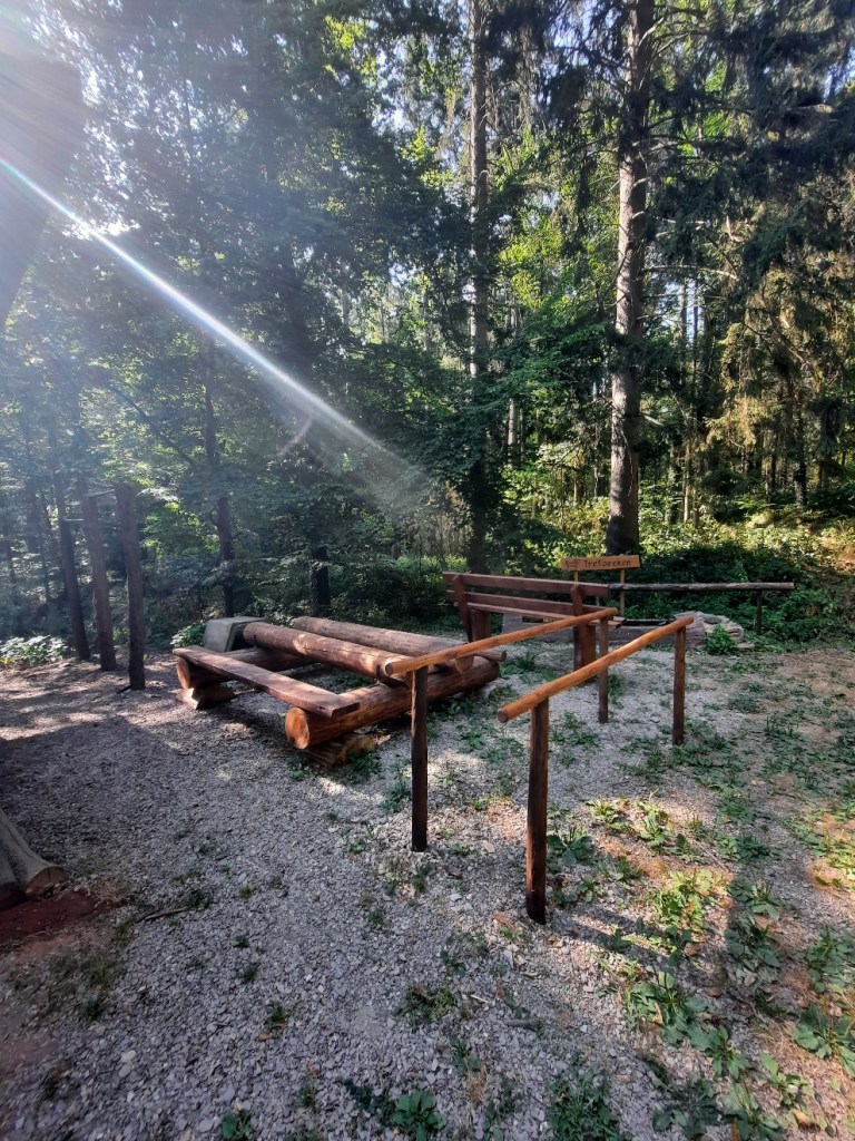 Über eine breite Waldstraße passiere ich eine Schutzhütte mit Wassertretbecken für Hund und Menschen und ein paar Fitnessgeräte aus Holz.