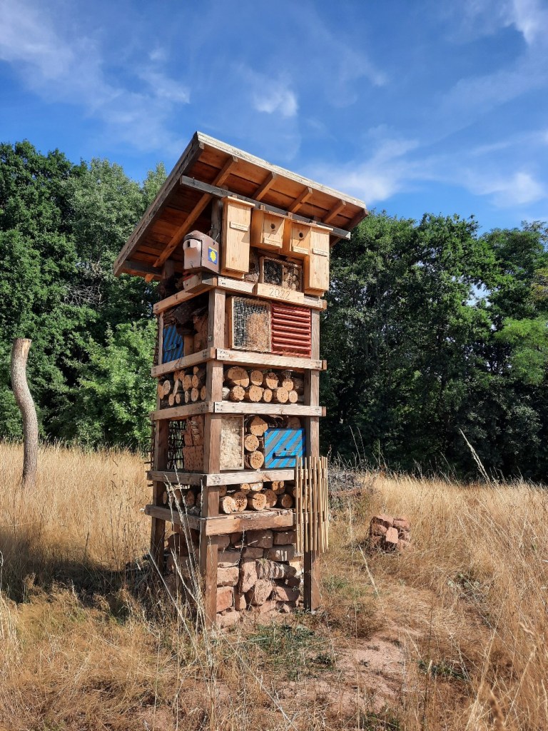 An einem Wanderoarkplatz steht ein sehr großes Insektenhotel, welche man auf dem Mosel-Camino in deutlich kleineren Ausführungen sehr häufig in Kombination mit dem Wegweiser sieht.