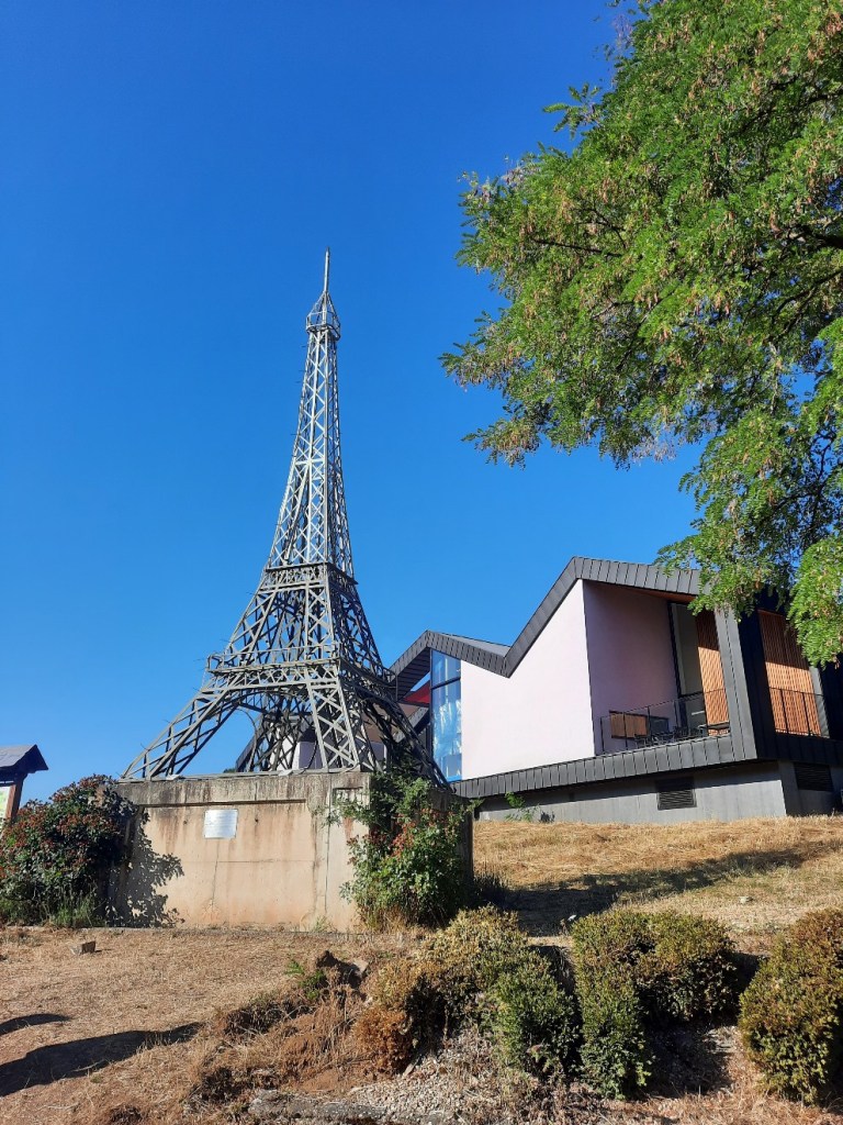 Nach knapp 600 Kilometern stehe ich vor der französischen Grenze, die durch ein paar Schilder und eine Miniversion des Eiffelturms zu erkennen ist.
