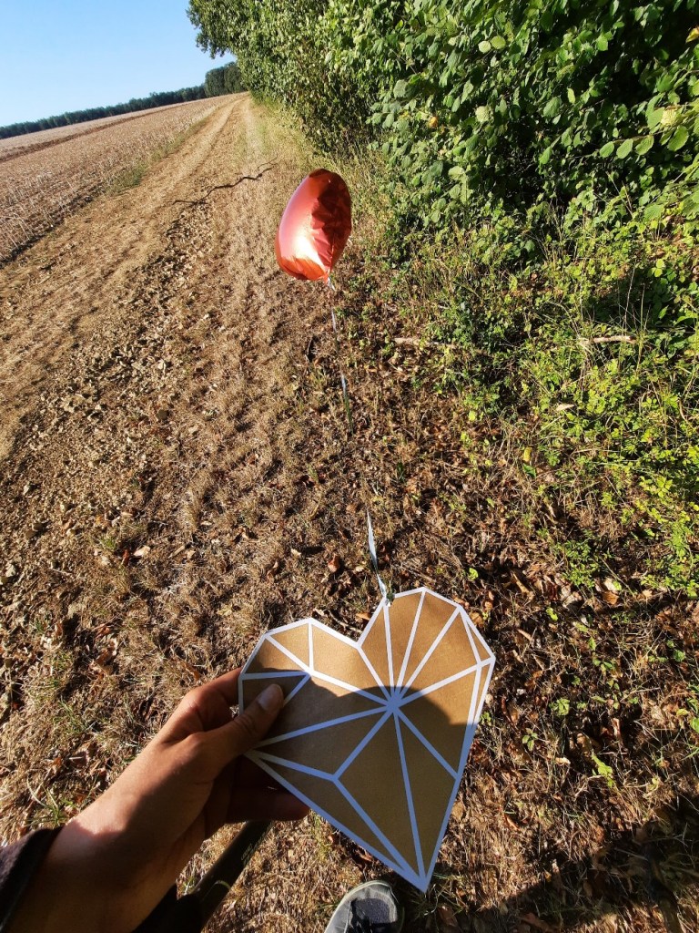Mit beklemmenden Gefühl laufe ich weiter, kurze Zeit später finde ich in einem Waldstück mal wieder einen Heliumballon. Dies ist sicherlich der 15. auf dieser Reise. Genervt sammel ich ihn auf, um ihn bei nächster Möglichkeit wegzuschmeissen. Ich entdecke eine Karte an ihm, er stammt von einer Hochzeit in Saarbrücken. Ca. 100 Kilometer hat der Ballon hinter sich.