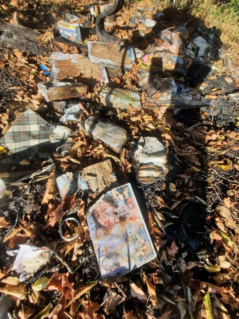 Keine zwei Minuten später treffe ich auf die nächste unschöne Entdeckung. Jemand hat versucht im Wald mehrere Sachen zu verbrennen, darunter alte erotische Filme. Was stimmt denn nicht mit den Menschen, denke ich und ziehe langsam und traurig weiter.