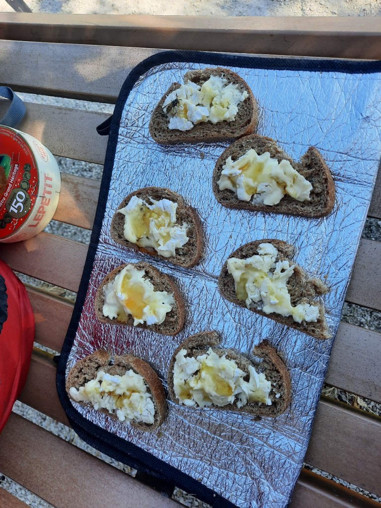 Da eine sehr kurze Etappe von 16 Kilometern ansteht, mache ich eine sehr lange Pause und esse mein Brot mit Camembert und Honig.