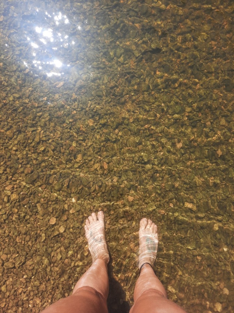 Am Ufer lasse ich die Füße in Ruhe trocknen, bevor ich über die Brücke das fließende Gewässer verlasse.