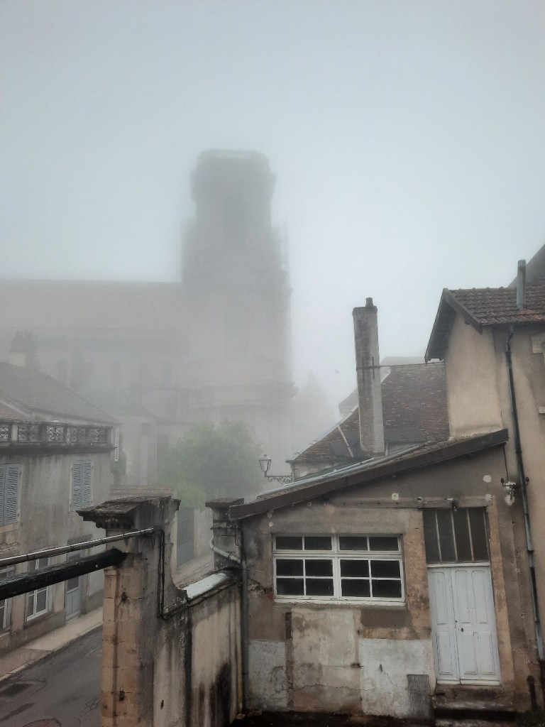 Mehrere Gewitter sind die Nacht über Langres hinweg gezogen. Der Donner war öfter erschreckend laut und heftig. Als ich am Morgen aus dem geöffneten Fenster gucke, sehe ich graues Nichts. Eine dicke Nebeldecke verschlingt die Häuser um uns herum.