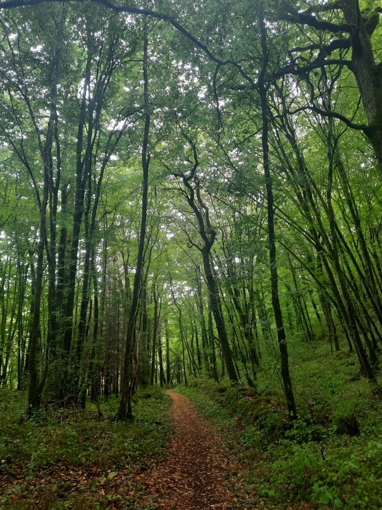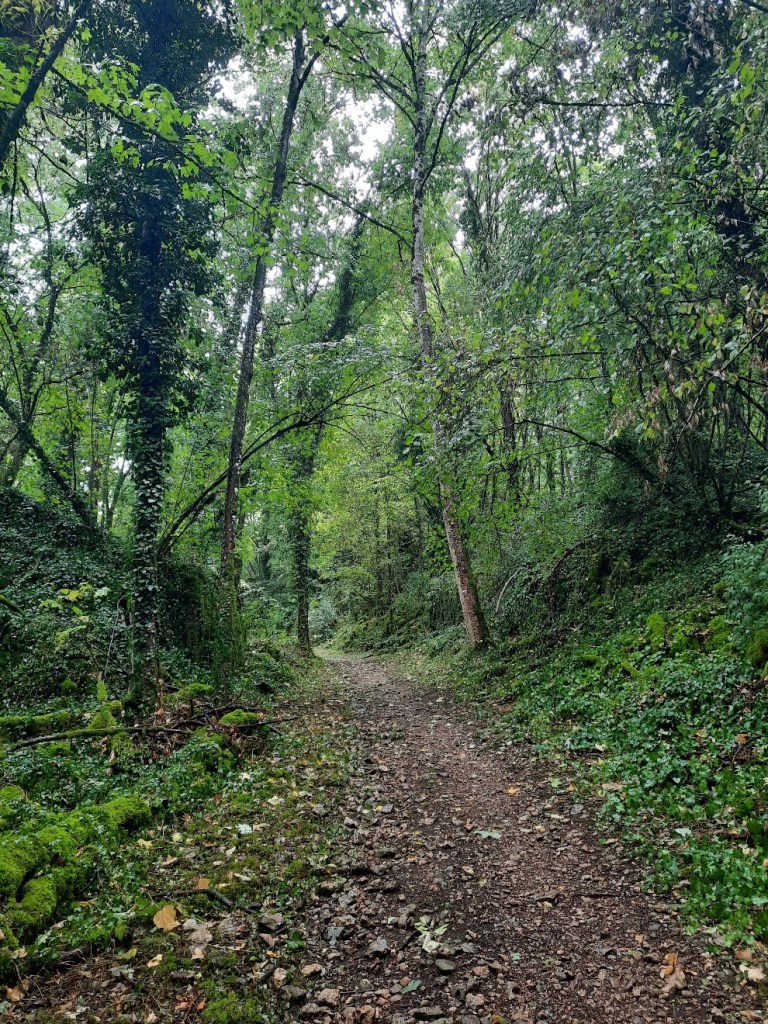 Weiter bergauf nimmt der Regen langsam ab und ich bin umgeben von einem wunderschönem Waldabschnitt. Efeu und Moos überziehen Steine und Baumstämme, dicke Tropfen bringen die grüne Umgebung zum Glänzen.