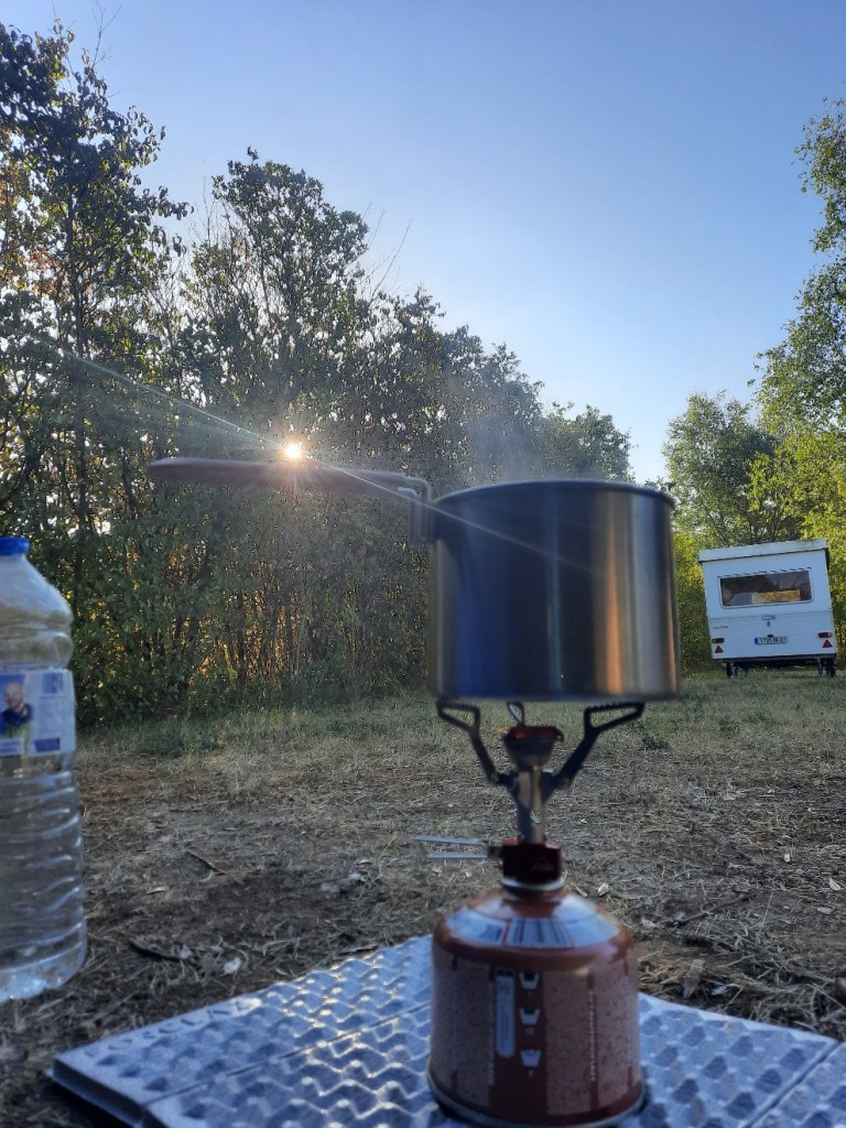 In Ruhe frühstücke ich und koche Kaffee. Der Morgen ist frisch, aber noch angenehm. Beim Zeltabbau komme ich ziemlich ins Schwitzen, die Temperatur zieht heute schnell an.