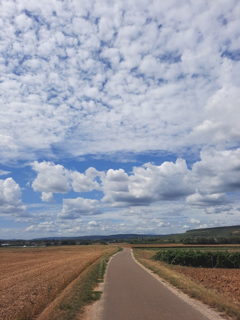 Aus Beaune raus sind sehr viele Fahrradfahrer unterwegs. Weiter zwischen gepflanztem Wein und in der Sonne laufe ich auf einer ruhigen Landstraße.