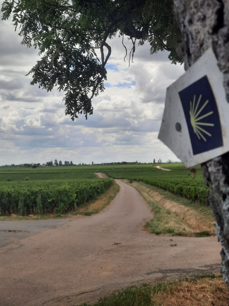 Vom Campingplatz laufe ich als erstes zurück zum Jakobsweg, durch Premeaux-Prissey einmal durch und zwischen dem angebauten Wein finde ich das blau-gelbe Schild schnell wieder.