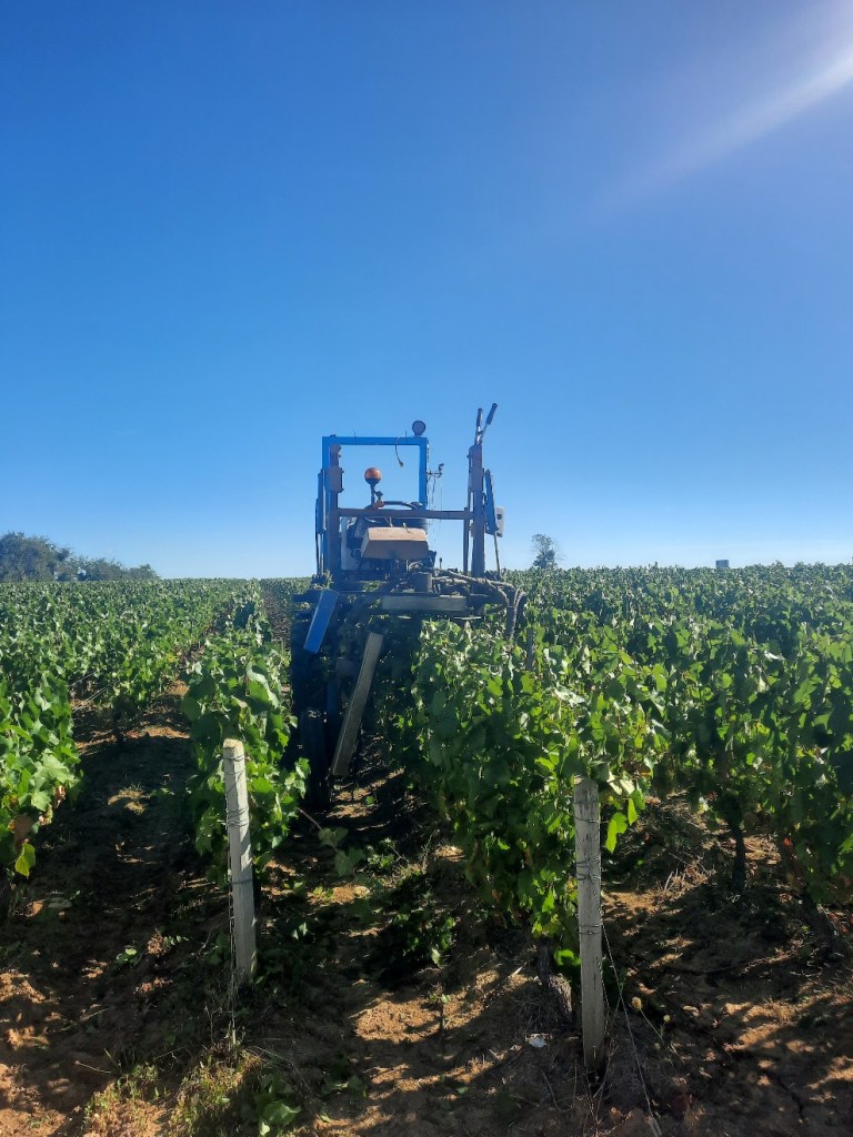 Ich sehe heute immer wieder spezielle Traktoren, die oben die Weinreben beschneiden. Meine Theorien sind, dass die tiefhängenden Trauben darunter genug Sonne abbekommen, oder es die Ernte erleichtert. Die Weintrauben schmecken schon recht süß, haben aber verhältnismässig sehr große Kerne.