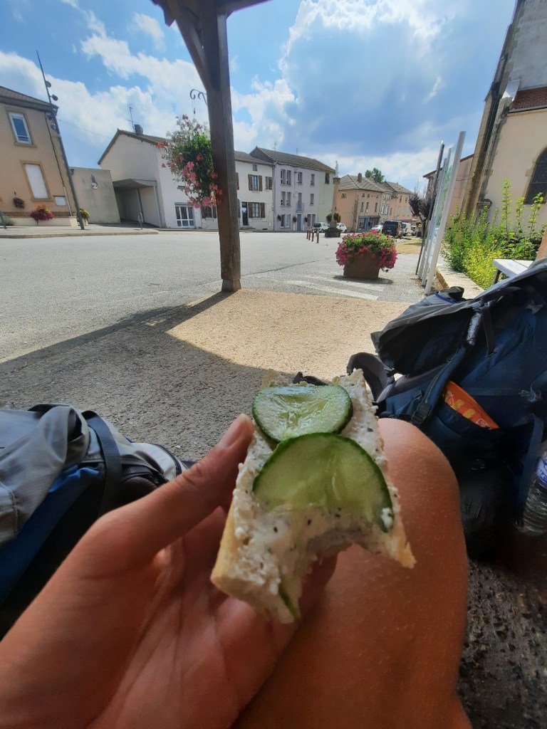 Weiter verläuft es eher flach, zieht zwischendurch nochmal steil bergauf an und leicht bergab erreichen wir Le Cergne. Dort gibt es nicht nur Wasser an einem privatem Haus, sondern auch Toiletten in der Ortsmitte. Ein Ehepaar schenkt uns dann sogar zwei frische Gurken aus dem Garten. Dies passt perfekt und so essen wir unser Baguette mit Knoblauchfrischkäse und dem frischen Gemüse.