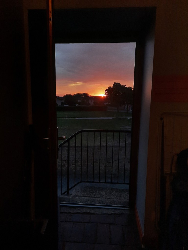 Der Schlaf auf einer Matratze war sehr wohltuend. Ich öffne die Tür nach draussen und ein strahlend pinker Himmel leuchtet uns entgegen, die Sonne ist kurz vor dem Aufgehen. Schaut man zur anderen Seite aus dem Fenster sieht man dunkle Wolken und eine Gewitterfront auf uns zu ziehen.