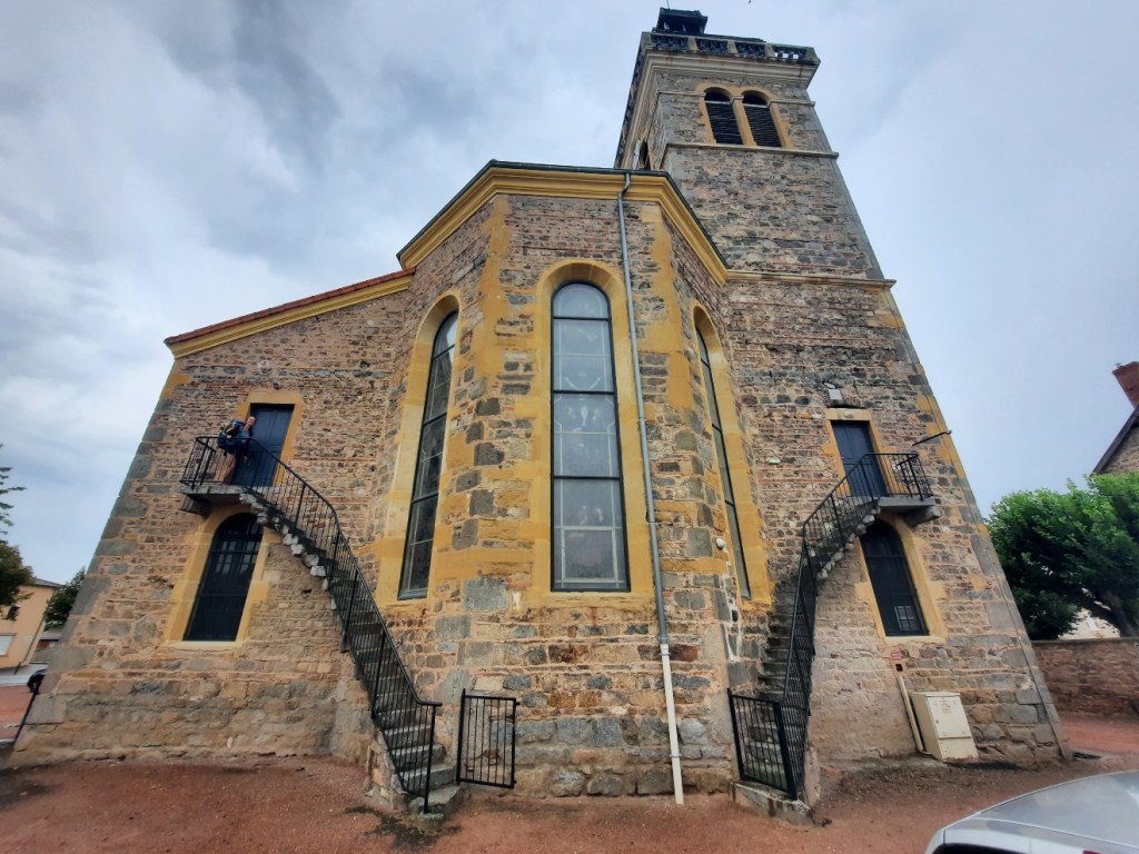 In Renaison setzen wir uns auf eine Metallbank, da es kurzzeitig aufgehört hat zu regnen. Als zweites Frühstück gibt es ein Mandelcroissant mit Schokoladenstückchen.