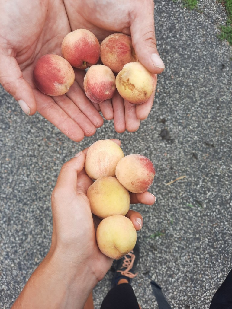 In Saint-Saon-le-Châtel nehmen wir auf einer Holzbank platz. Da es heute gewittern und regnen soll, reservieren wir zwei Betten in einer Unterkunft. Wir wollen gerade essen, da fängt es wieder leicht an zu regnen. Wir beschließen weiterzulaufen und nach einer überdachten Pausenmöglichkeit zu suchen. Aus dem Dorf heraus bietet uns ein Mann Pfirsiche an, die er gerade von seinem Baum pflückt. Dankend nehmen wir die süßen Früchte entgegen und kindliche Freude breitet sich bei uns aus.