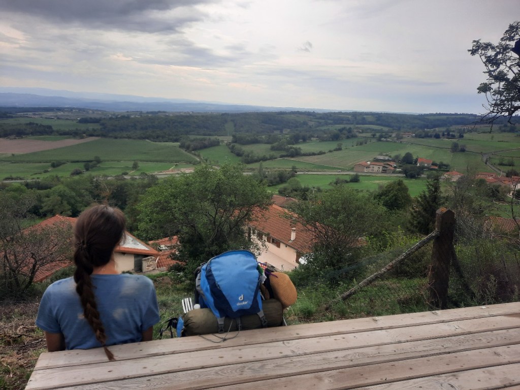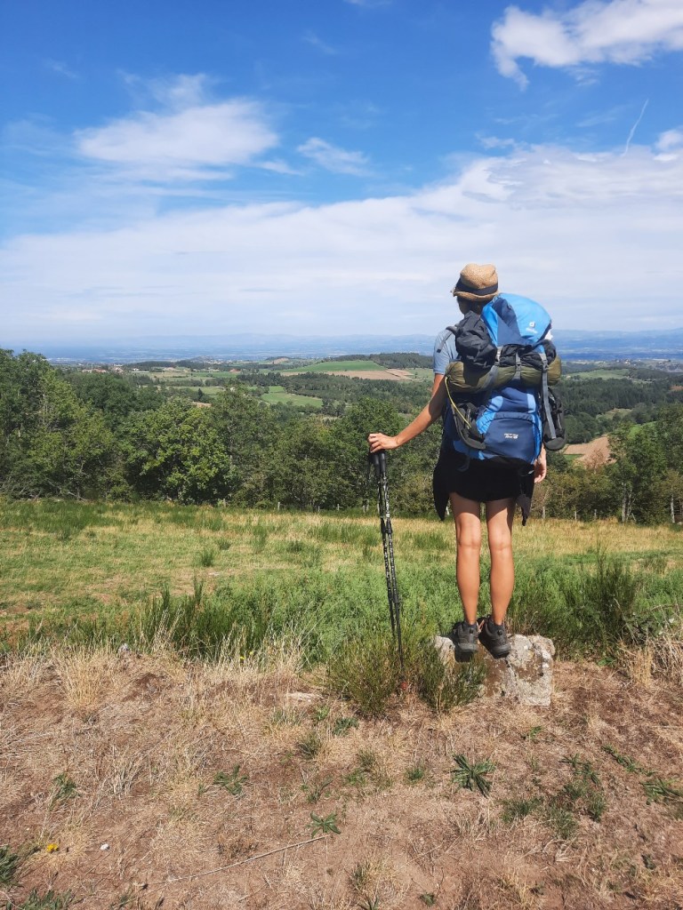 In Saint-Jean Soleymieux füllen wir unser Wasser auf und bewältigen die nächsten Höhenmeter. Der Waldweg wird schmaler und wir bewundern die tolle Umgebung. Der Untergrund ist sehr sandig. Wurzeln und große Steine erfordern eine höhere Konzentration.