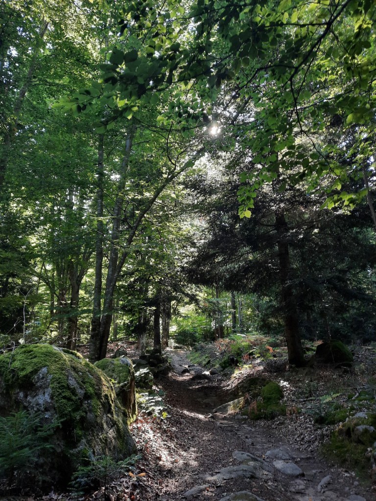 Die letzten fünf Kilometern wollen es nochmal wissen. Mark geht vor, da wir berghoch doch ein anderes Tempo haben. Der Waldweg ist wunderschön, er ist umrandet von großen mit Moos bewachsen Steinen. Ich werde sehr an Asterix und Obelix-Filme erinnert.
