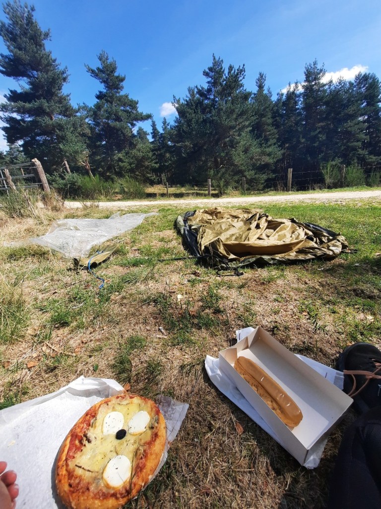In Aumont-Aubrac erreiche ich den Supermarkt zu spät, er hat schon Mittagspause. Bei einer Bäckerei kaufe ich Pizza, einen Eclair und eine Cola. Ich möchte eine längere Pause in der Natur machen. Mit den Wanderstöcken in der linken Hand und dem Essen in der Rechten führt es mich noch 3 Kilometer weiter, bis ich einen Waldrand finde.