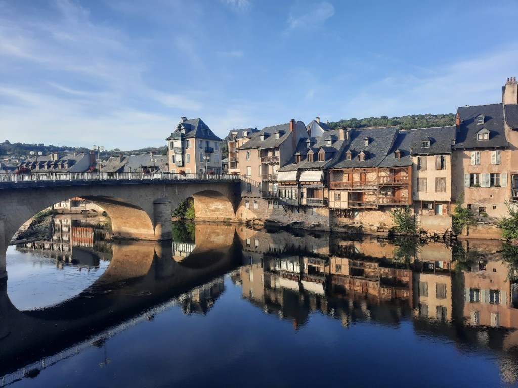 Ich verlasse den Ort über eine Brücke und den Fluss Lot. Der Jakobsweg in den Wald hoch ist abgesperrt, man soll der Landstraße folgen. An diesem heißen Tag passt mir das sehr gut, denn ich spare so knapp 2 Kilometer. In Espalion muss ich feststellen, dass der Campingplatz schon seit August geschlossen ist. Ich rufe eine Pilgerunterkunft an, die mir erst mitteilt, dass sie voll sind und mich dann nach wenigen Minuten zurückruft, da sie zwei Absagen haben. Per SMS sendet man mir den Pin für die Unterkunft und ich kann um 15:45 Uhr in das Haus eintreten.