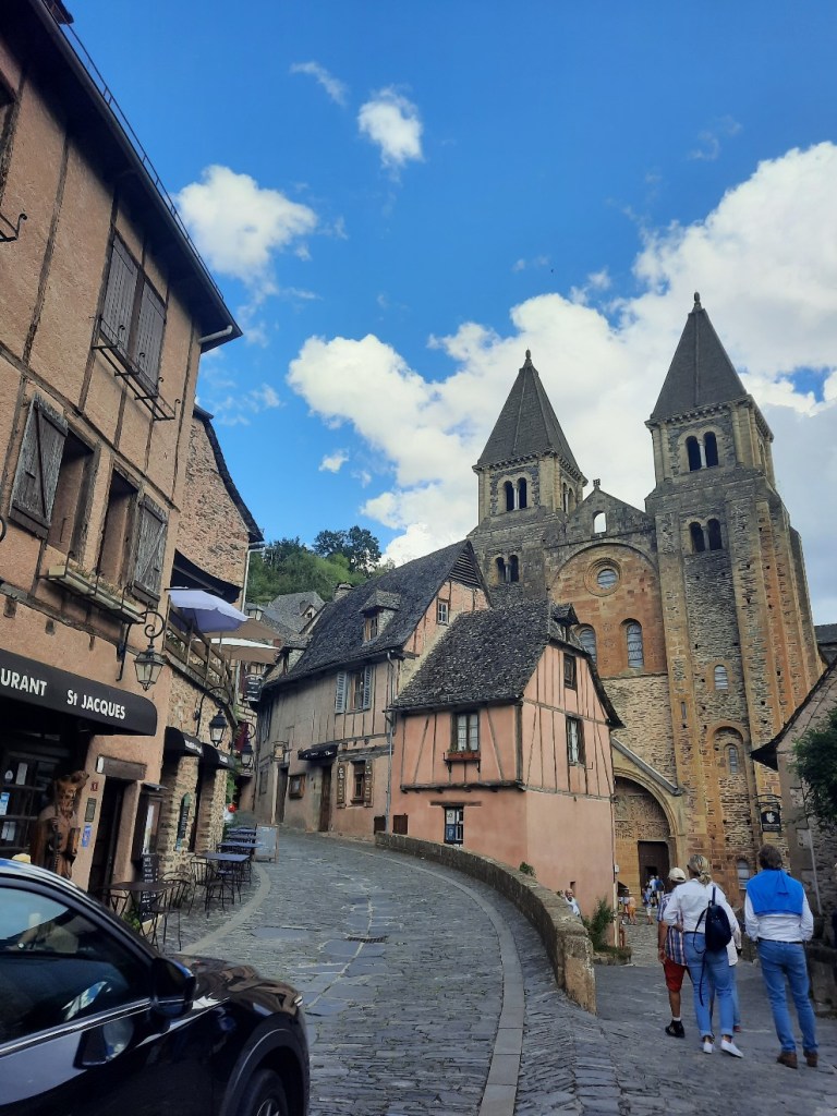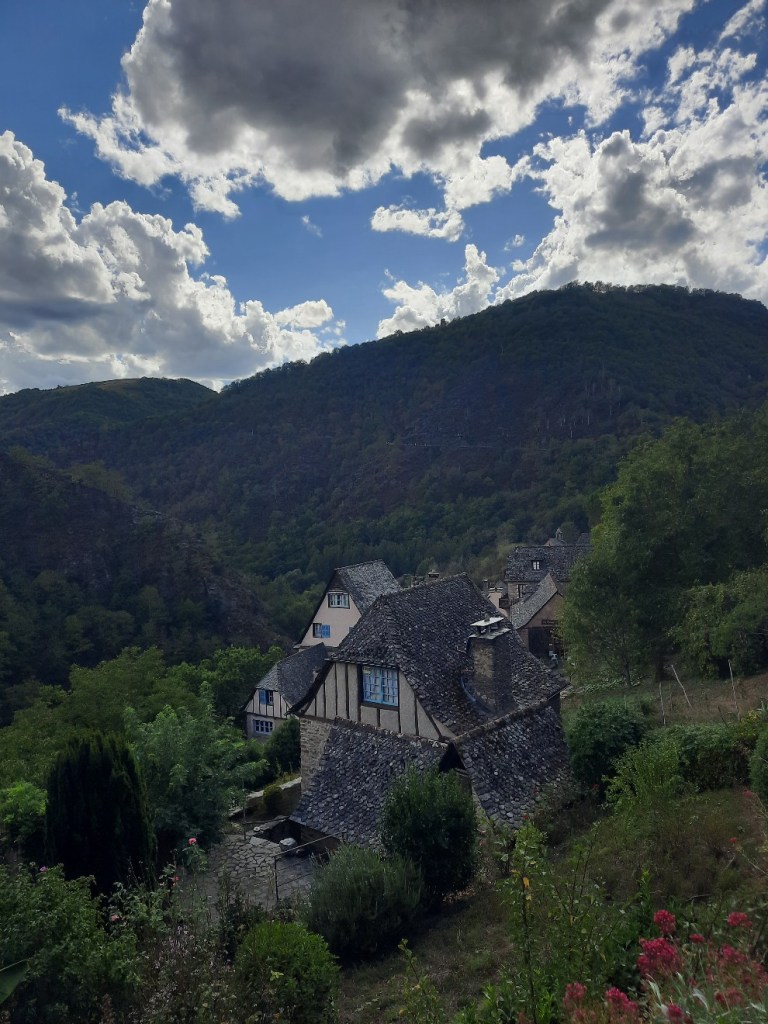 Kurz vor meinem Etappenziel laufe ich steil bergab ins Tal. Conques ist nur ein kleines Dorf, aber es wird als eines der schönsten in Frankreich beschrieben. Der Ort ist zwischen den Bergen gelegen und sehr idyllisch. Die Häuser aus Stein versetzen mich in eine andere Zeit zurück.